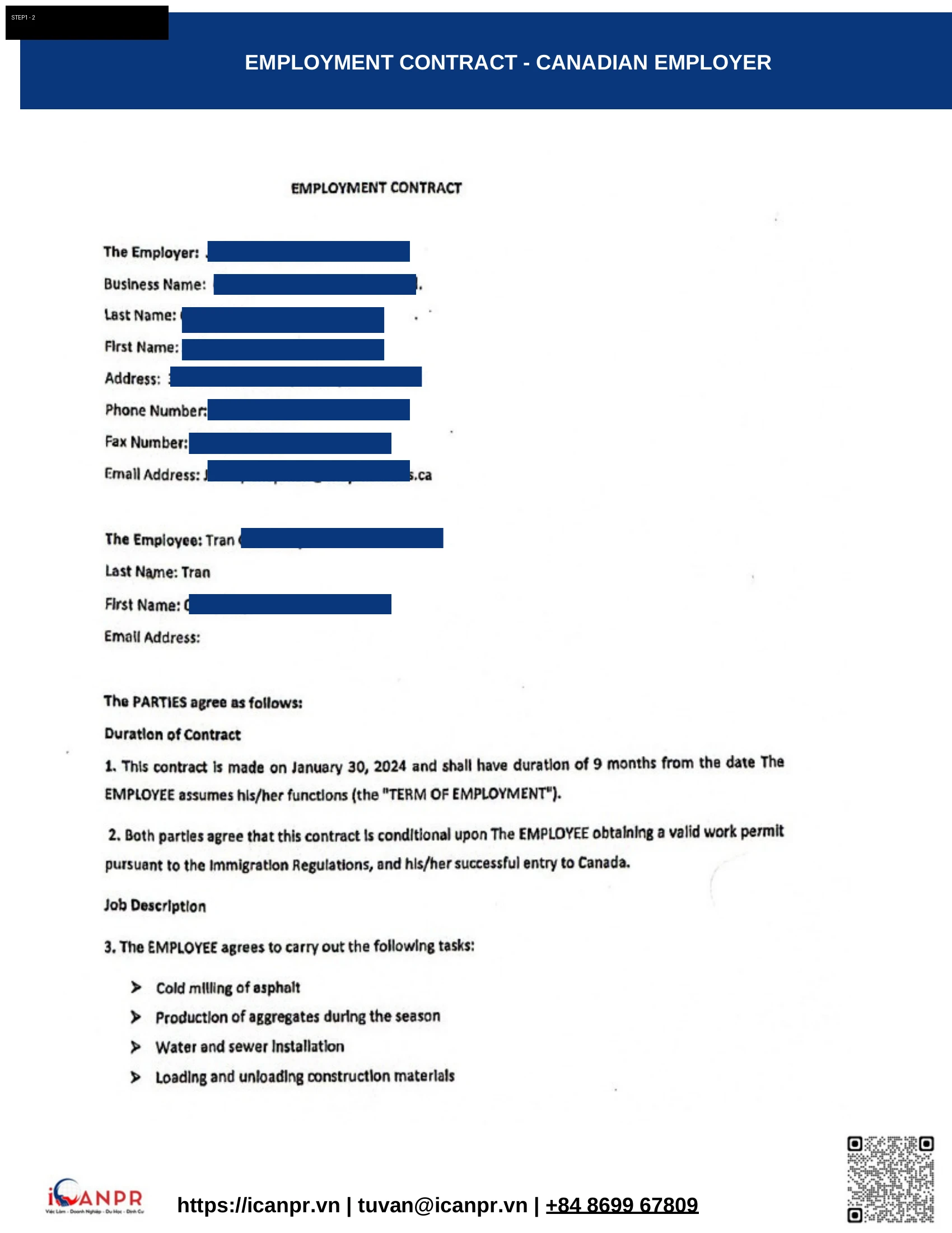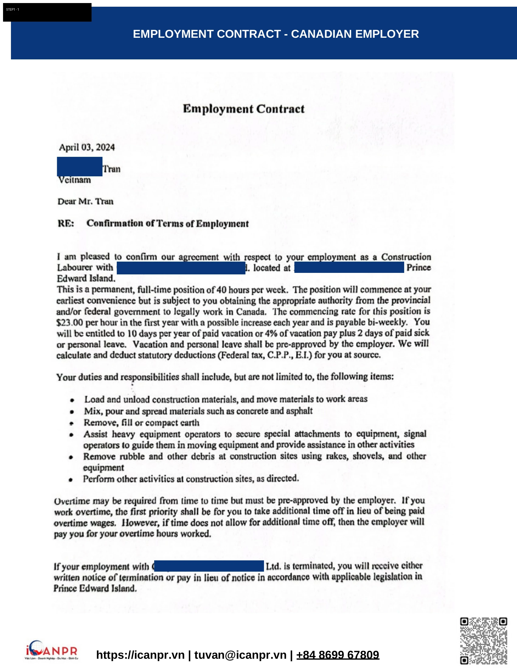 Nhận Employment Contract từ công ty xây dựng tại Souris, Prince Edward Island. Vị trí Construction Labourer, full-time 40 giờ/tuần, lương $23/giờ. Hợp đồng bao gồm đầy đủ phúc lợi: nghỉ phép 10 ngày, 4% vacation pay, đóng CPP và EI.
