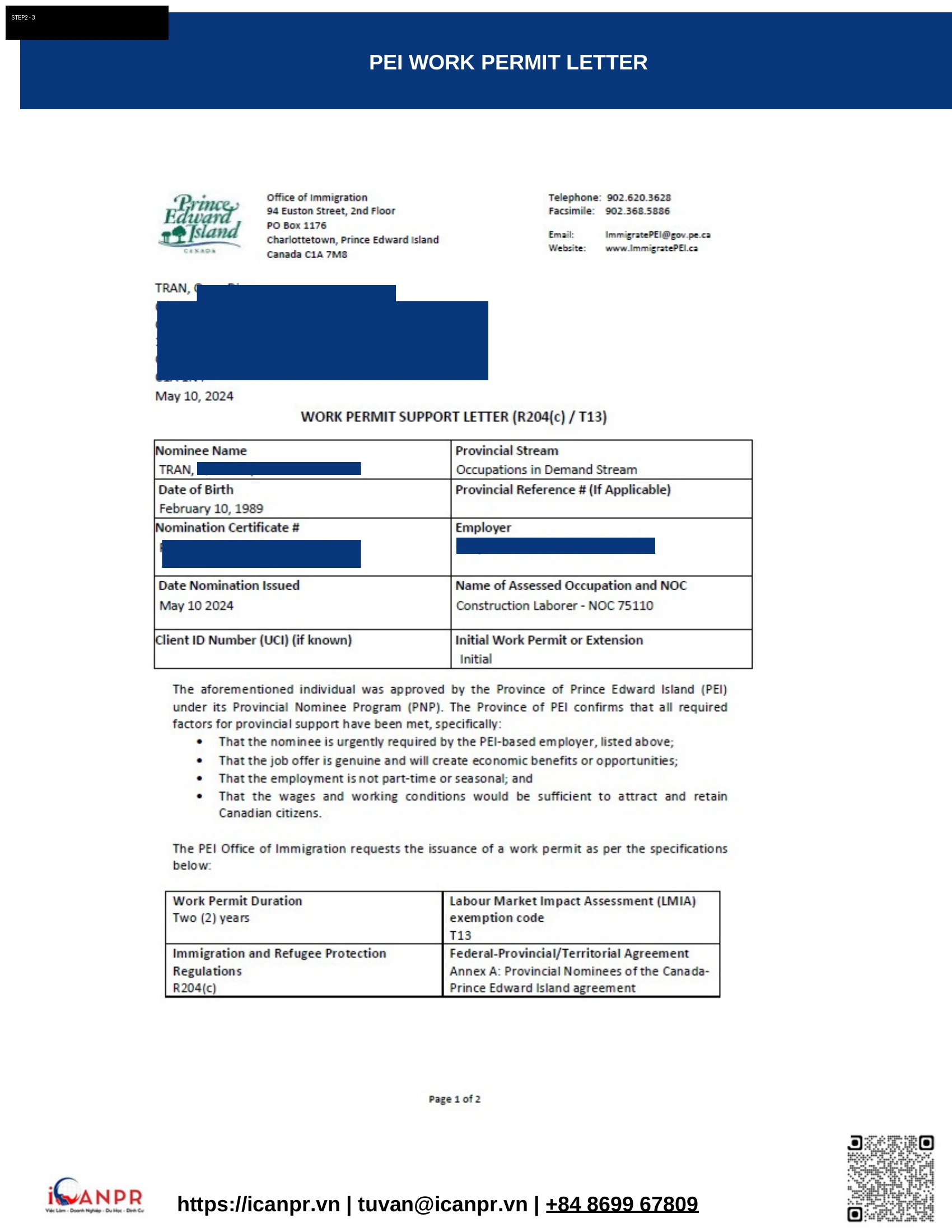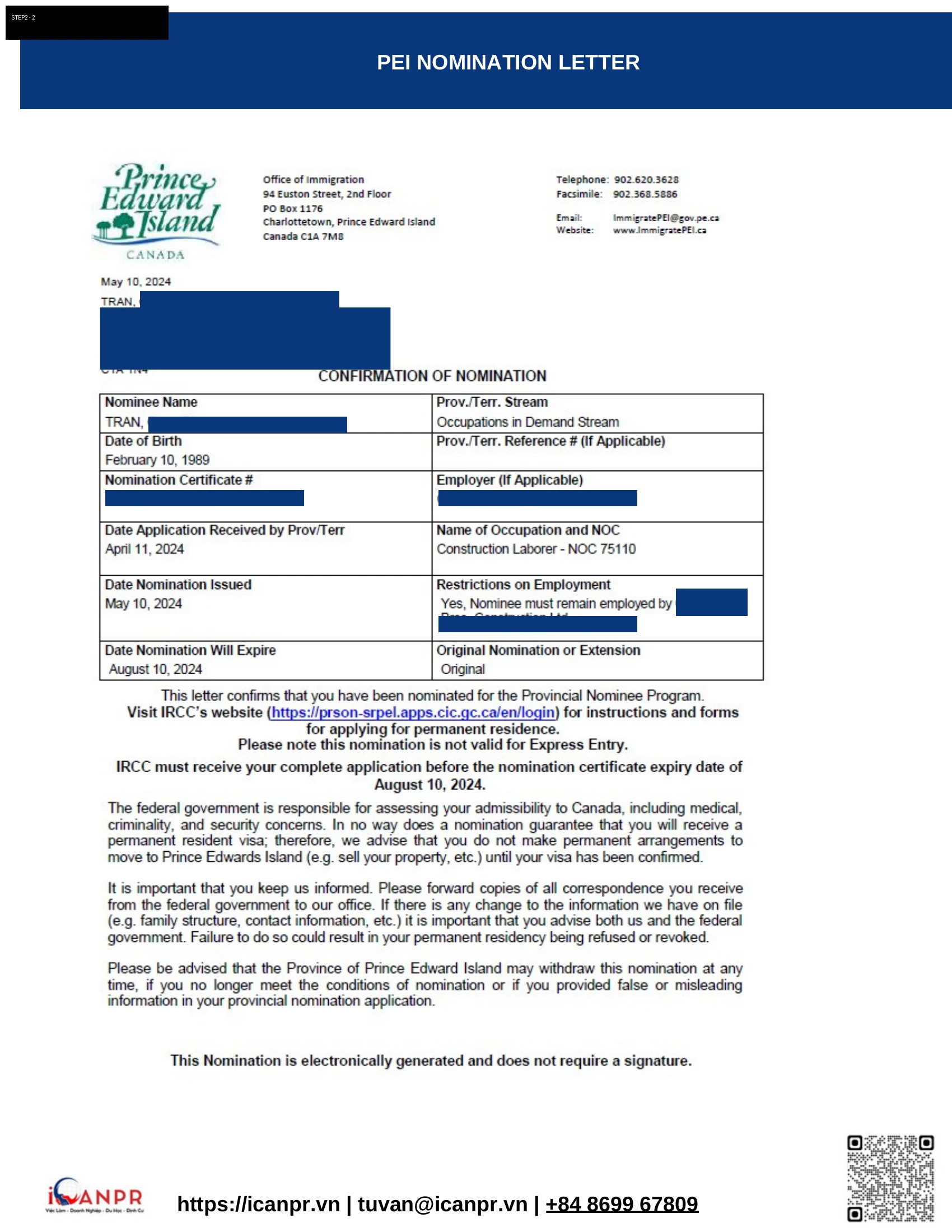 Nộp hồ sơ PEI PNP Occupations In-Demand ngày 11/04/2024. Chỉ sau 29 ngày, ngày 10/05/2024, nhận được Confirmation of Nomination và Work Permit Support Letter (R204(c)/T13) — miễn LMIA nhờ Provincial Nominee Agreement.